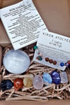 7 Çakra Kiti içinde; 7 çakra bilekliği, Selenit taşı, Siyah turmalin,Karneliyan,ASitrin,Pembe Kuvars,M.Dantel Akik,Ametist, Kristal Kuvars taşları, Çakra aktivasyon kiti için Ritüel uygulama açıklaması bulunmaktadır.
